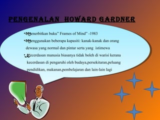 . 221 Teori Pelbagai Kecerdasan Howard Gardner 1983 1993 Pada tahun 1983 seorang ahli psikologi barat iaitu Howard Gardner telah mengasaskan satu teori yang berkaitan dengan kecerdasan iaitu teori kepelbagaian kecerdasan melalui bukunya Gardner Frames of Mind. Beliau telah membuat kajian terhadap pelbagai lapisan masyarakat termasuklah kanak-kanak biasa dan istimew a juga kelo mpok penduduk yang mempunyai kriteria yang. Oleh itu Gardner tidak bertentangan dengan definisi saintifik mengenai kecerdasan sebagai kemampuan.