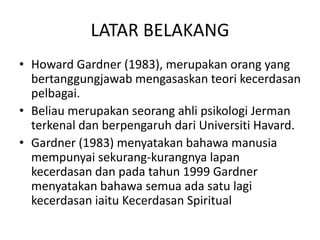Teori Kecerdasan Pelbagai ini telah diperkenalkan oleh How ard Gardner 1983. Teori ini hasilnya daripada kajian beliau yang dijalankan dengan kanak-kanak biasa dan kanak-kanak istimewa. Abstrak Terdapat pelbagai teori kecerdasan telah dikemukakan di Barat termasuk mutakhir ini kecerdasan spiritual atau kecerdasan rohani SQ atau.